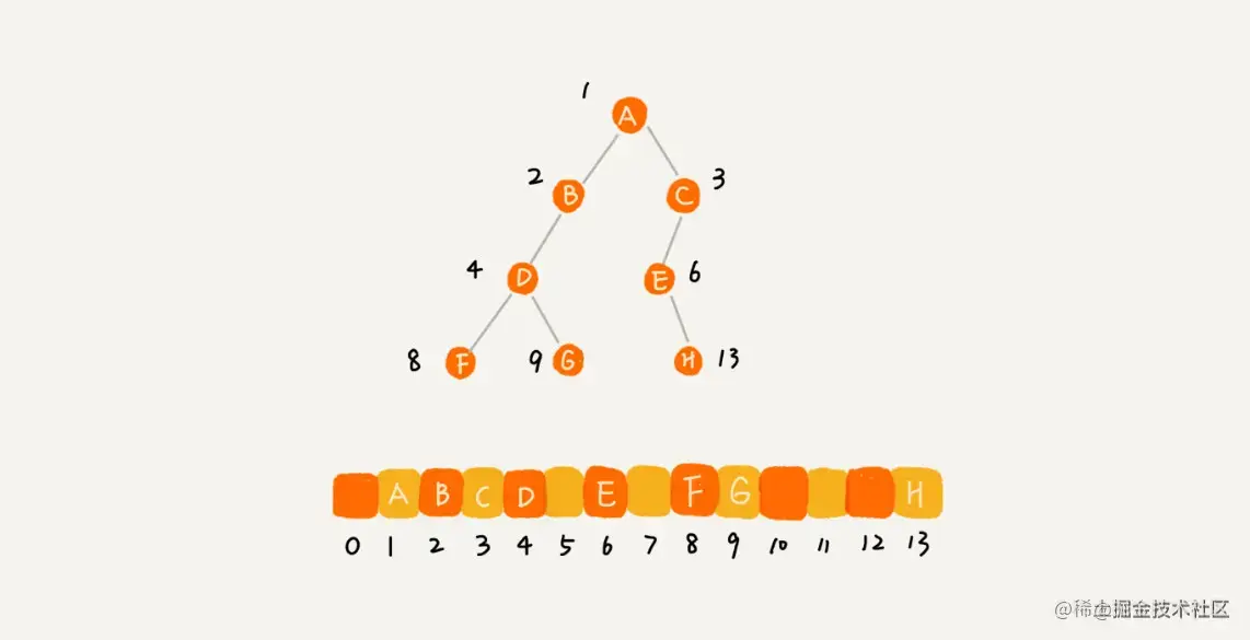 如果节点 X 存储在数组中下标为 i 的位置,下标为 2 * i 的位置存储的就是左子节点,下标为 2 * i + 1 的位置存储的就是右子节点。反过来,下标为 i/2 的位置存储就是它的父节点。通过这种方式,我们只要知道根节点存储的位置(一般情况下,为了方便计算子节点,根节点会存储在下标为 1 的位置),这样就可以通过下标计算,把整棵树都串起来。