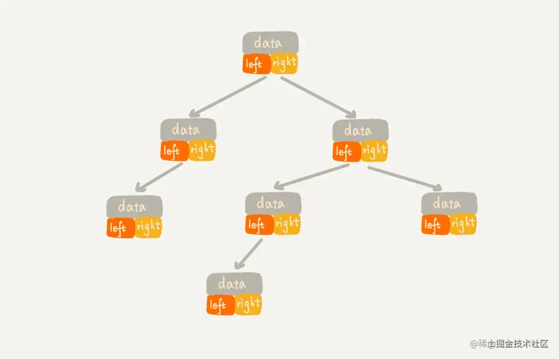 每个节点有三个字段,其中一个存储数据,另外两个是指向左右子节点的指针。我们只要拎住根节点,就可以通过左右子节点的指针,把整棵树都串起来。这种存储方式我们比较常用。大部分二叉树代码都是通过这种结构来实现的。