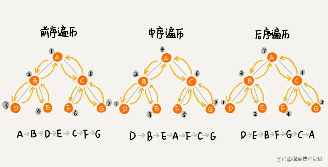 - 前序遍历是指,对于树中的任意节点来说,先打印这个节点,然后再打印它的左子树,最后打印它的右子树。
