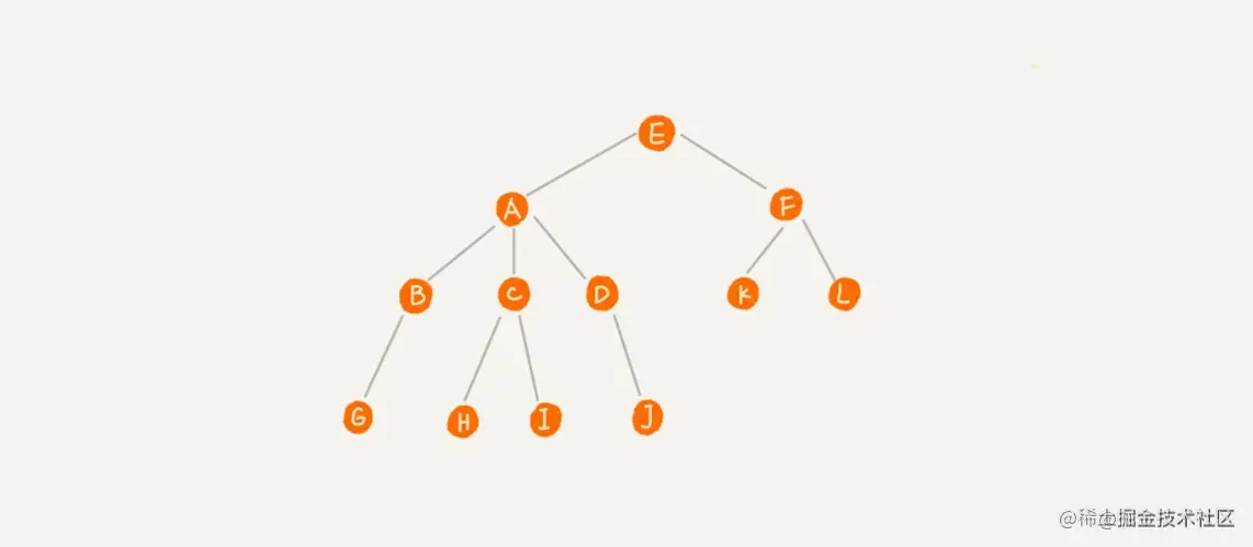 比如下面一幅图,A 节点就是 B 节点的父节点,B 节点是 A 节点的子节点。B、C、D 这三个节点的父节点是同一个节点,所以它们之间互称为兄弟节点。我们把没有父节点的节点叫做根节点,也就是图中的节点 E。我们把没有子节点的节点叫做叶子节点或者叶节点,比如图中的 G、H、I、J、K、L 都是叶子节点