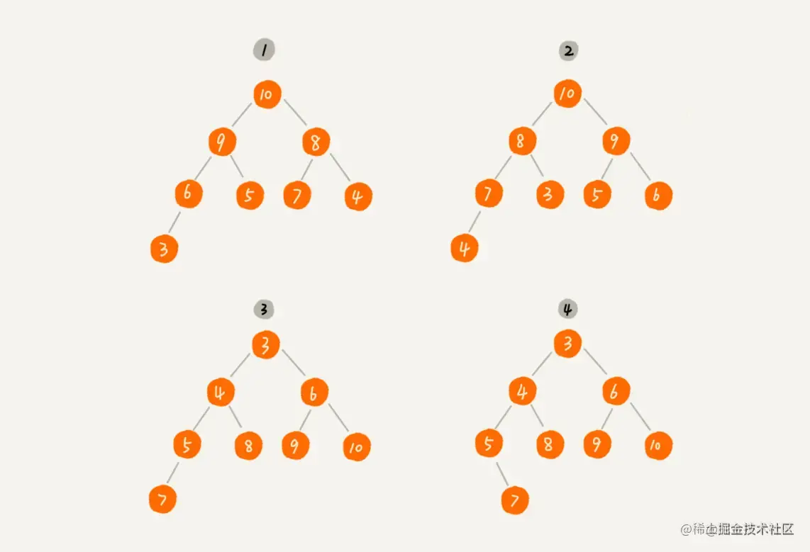 其中第 1 个和第 2 个是大顶堆,第 3 个是小顶堆,第 4 个不是堆。除此之外,从图中还可以看出来,对于同一组数据,我们可以构建多种不同形态的堆。