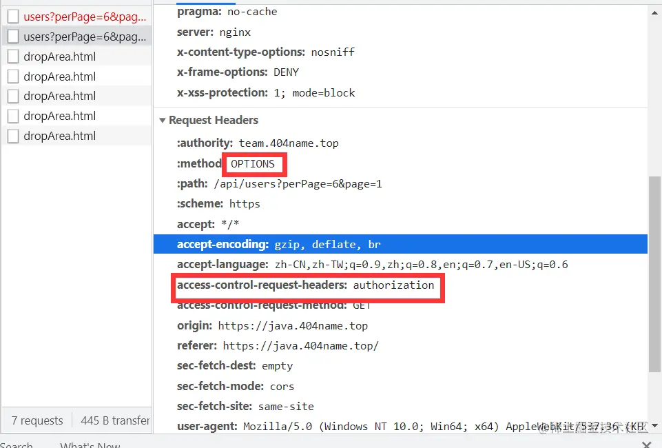 包含自定义header字段的跨域请求,浏览器会先向服务器发送OPTIONS请求,探测该服务器是否允许自定义的跨域字段。