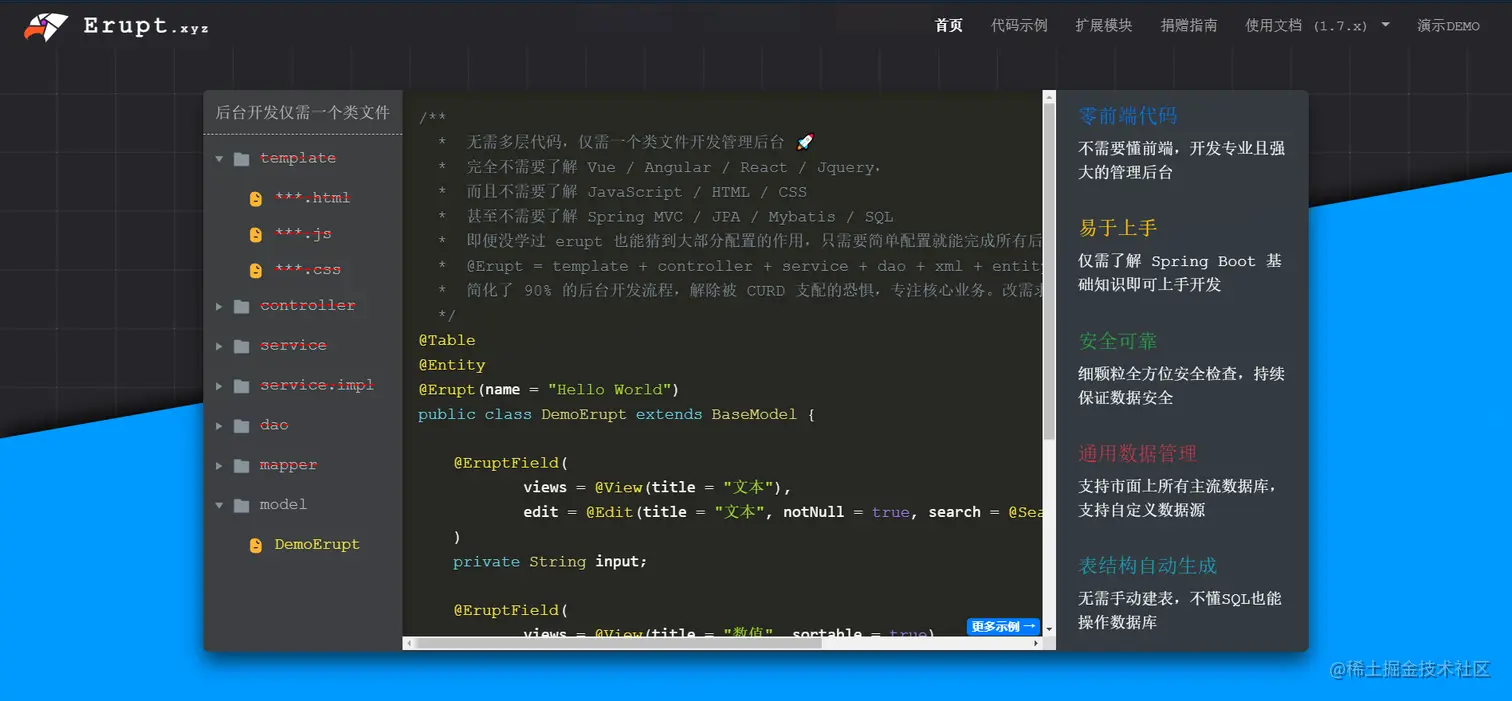 - 首先吹爆Erupt框架!!这个框架简直是后台开发利器,你甚至不需要先建表,直接拿来跑就出现了后台管理页面,利用代码生成反向生成实体类,直接映射生成了数据库,配合jpa,熟悉的话1小时不用一个简单的系统包括后台包括全套api就实现了。让你把时间放到具体业务上!!