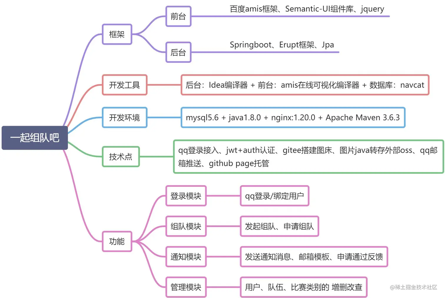 qq登录 -- 用户绑定 -- 生成令牌 -- 组队请求[jwt校验 + 图片存储] -- 邮箱通知