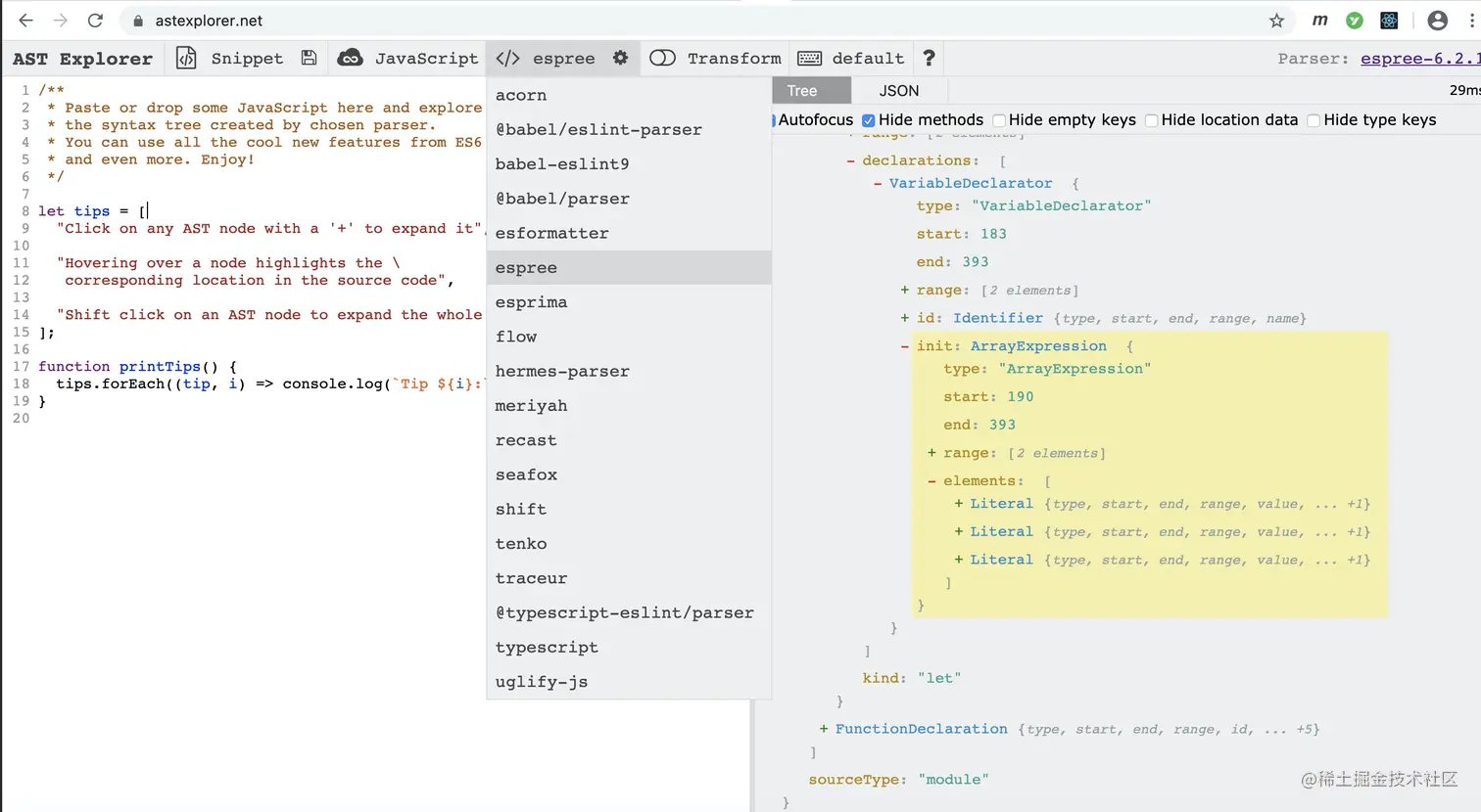 可以借助 astexplorer.net 这个工具来可视化的查看不同 parser 产生的 AST。