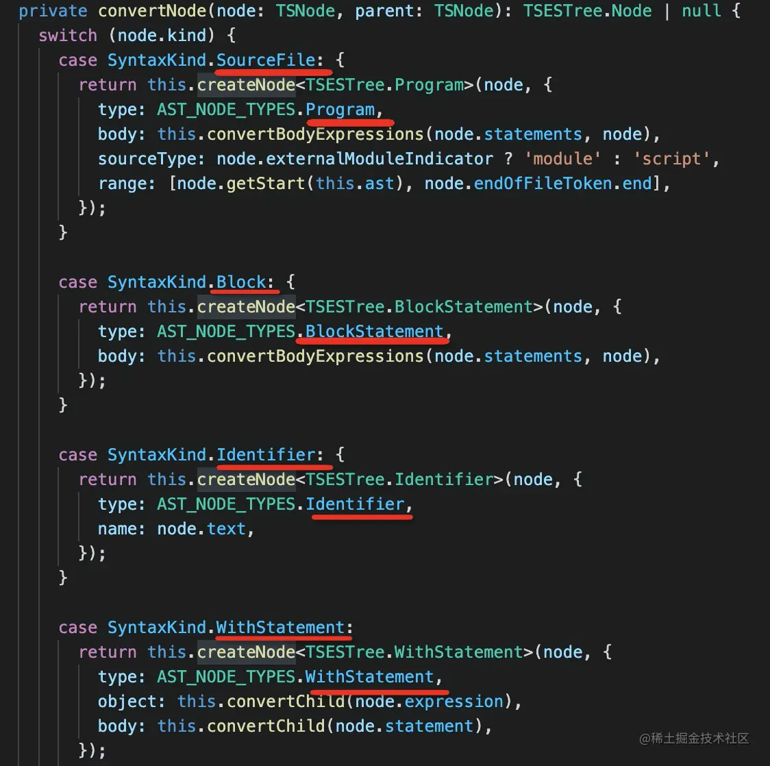 具体转换的过程,其实就是遍历 ts 的 AST,然后创建新的 estree 的 AST。