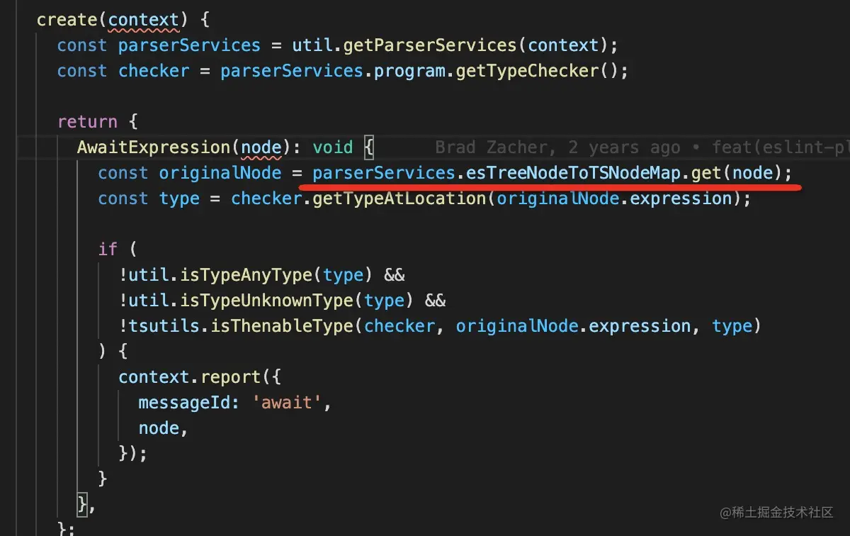 eslint 的自定义 parser 的返回结果中,除了有 ast,还支持返回 services,这是用于放一些其他信息的,比如这里用到的 map,还有 ts 的 program 的 api(比如 program.getTypeChecker 这种)。那么需要的时候就可以从 estree 的 ast 再映射回 ts 的 ast 了。