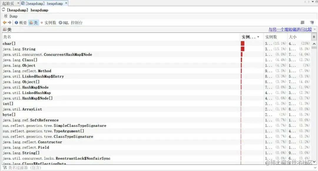 访问:http://localhost:8080/actuator/heapdump会自动生成一个 Jvm 的堆文件 heapdump。我们可以使用 JDK 自带的 Jvm 监控工具 VisualVM 打开此文件查看内存快照。