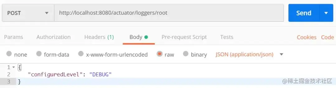 比如,我们可以通过下述方式来修改 root logger的日志等级。我们只需要发起一个URL 为http://localhost:8080/actuator/loggers/root的POST请求,POST报文如下: