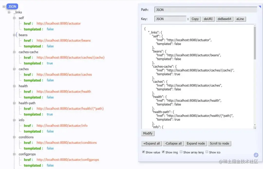 启动DEMO程序,访问http://localhost:8080/actuator,查看暴露出来的端点: