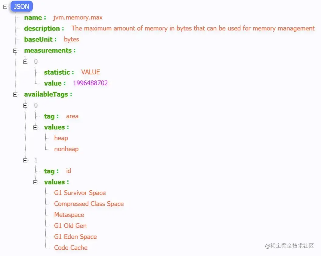 比如我访问/actuator/metrics/jvm.memory.max,返回信息如下: