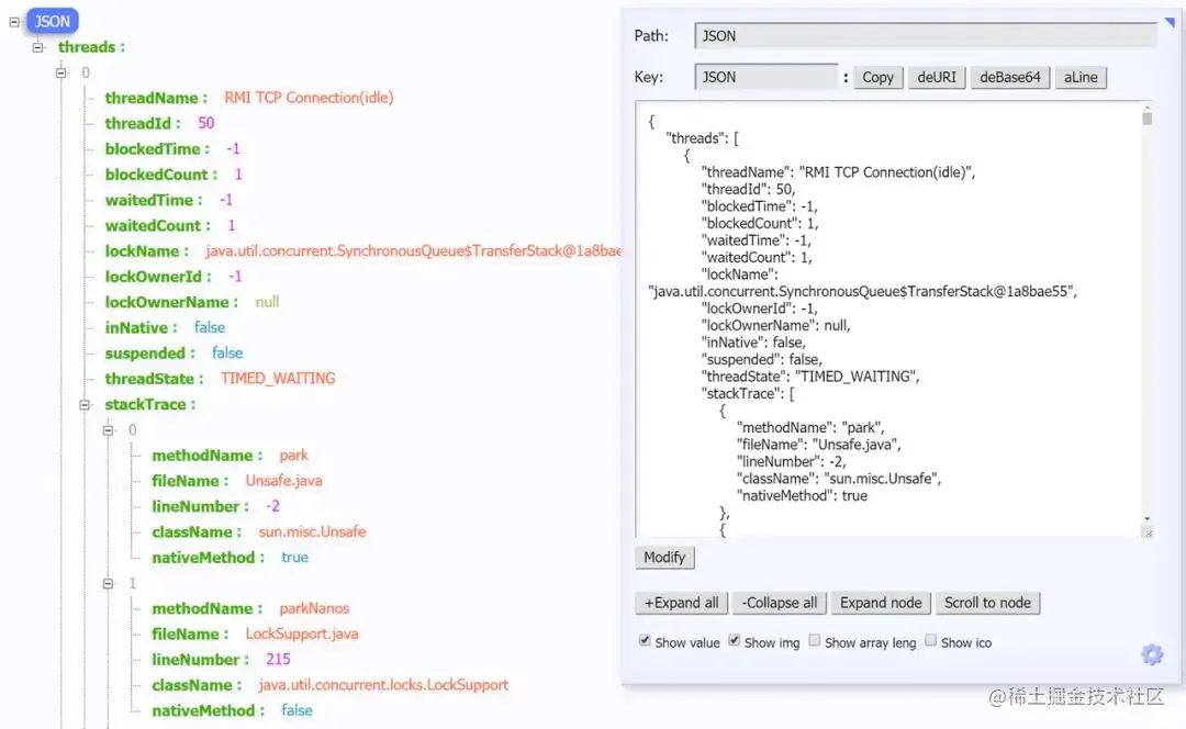 这个端点我个人觉得特别有用,方便我们在日常定位问题的时候查看线程的情况。主要展示了线程名、线程ID、线程的状态、是否等待锁资源、线程堆栈等信息。就是可能查看起来不太直观。访问http://localhost:8080/actuator/threaddump返回如下: