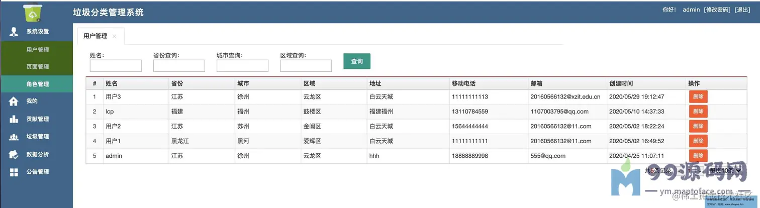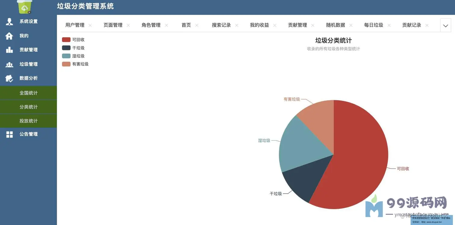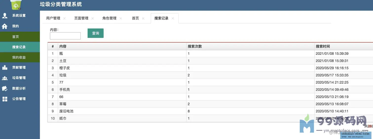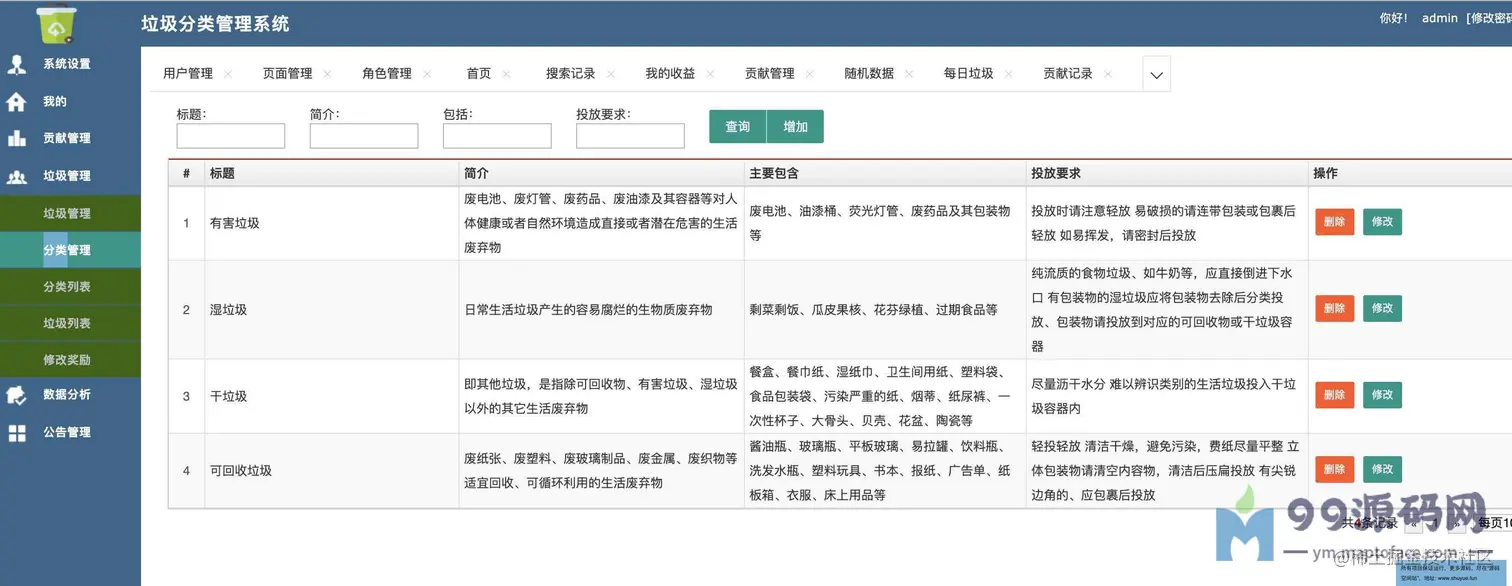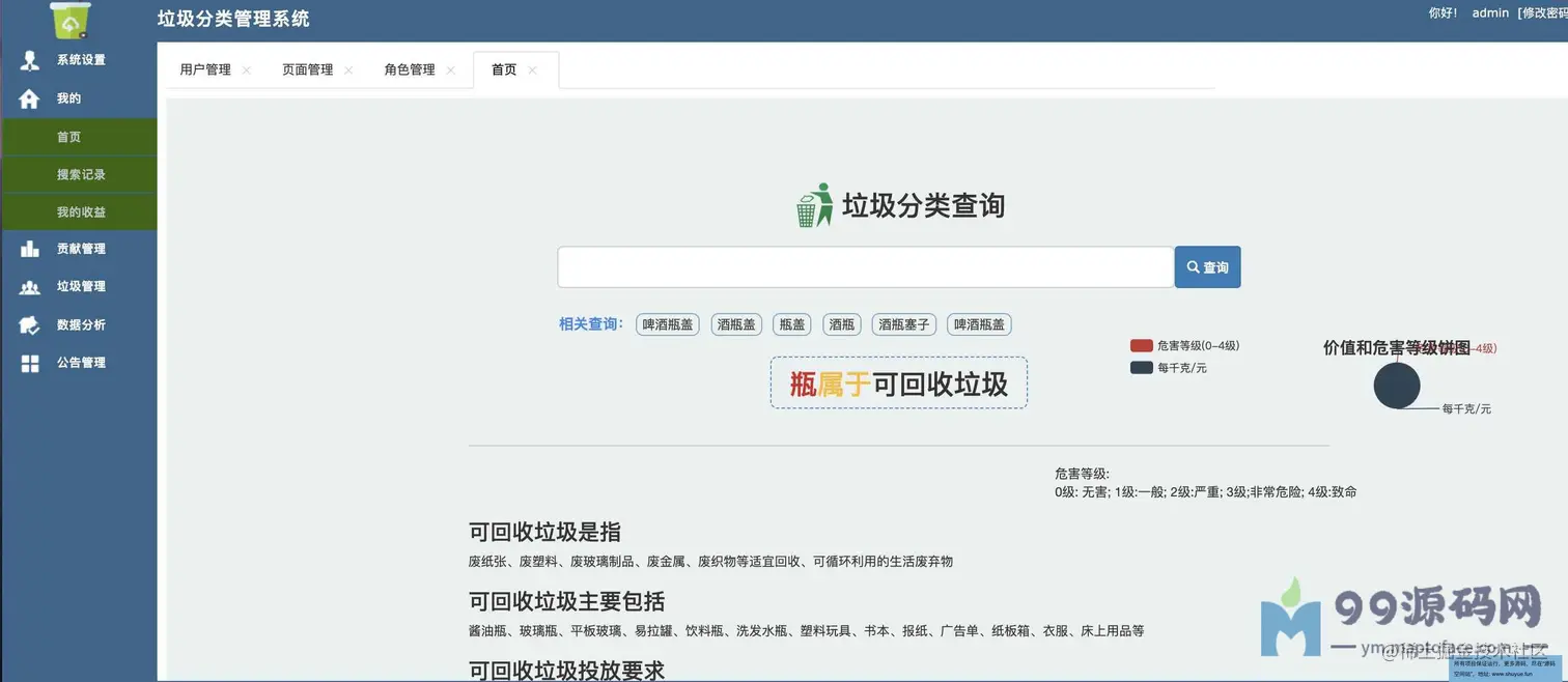 渣滓分类查询管理系统。共分为两种角色,管理员、普通用户。