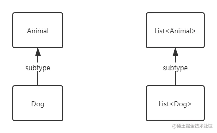 在Dog is subtype of Animal的情况下,List<Animal> 与 List<Dog> 能够相互赋值