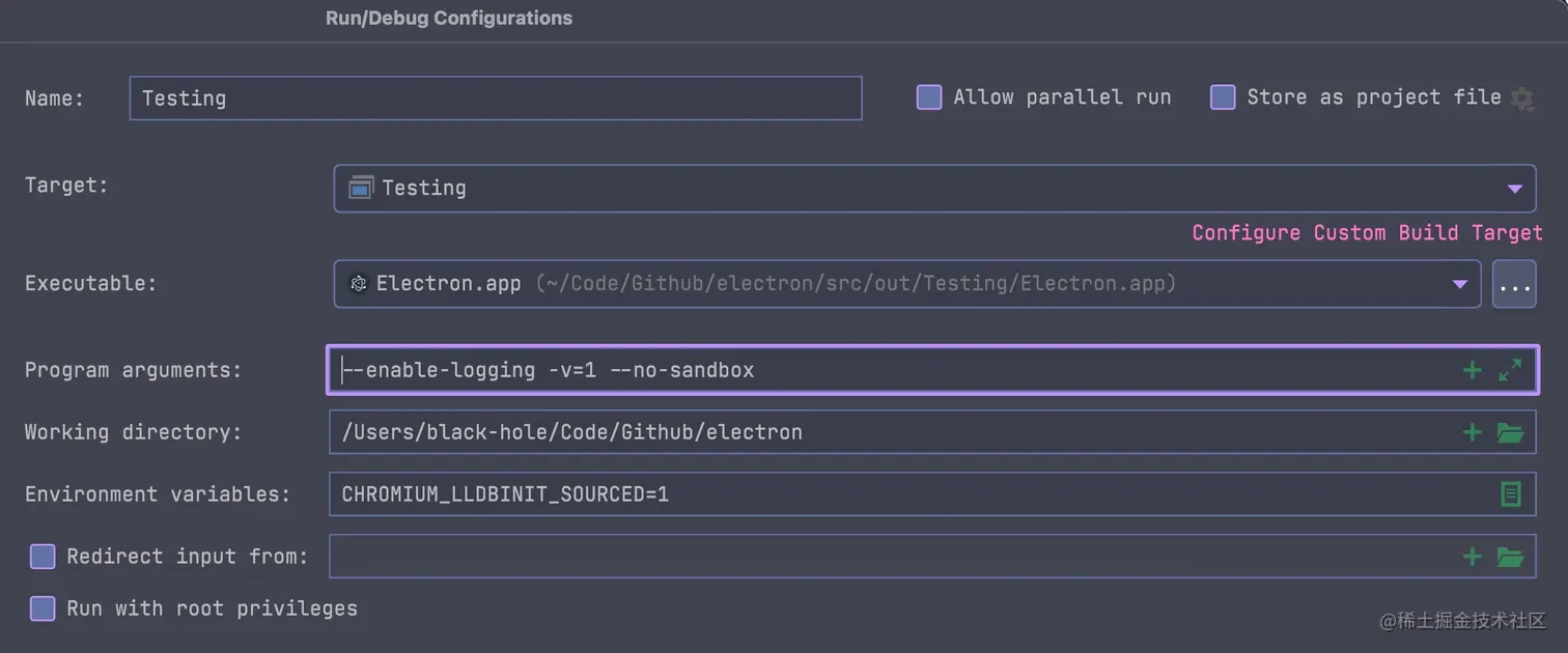你如果想使用自编译的 electron 打开自己的应用,直接在 Program arguments 里添加你的应用的地址即可