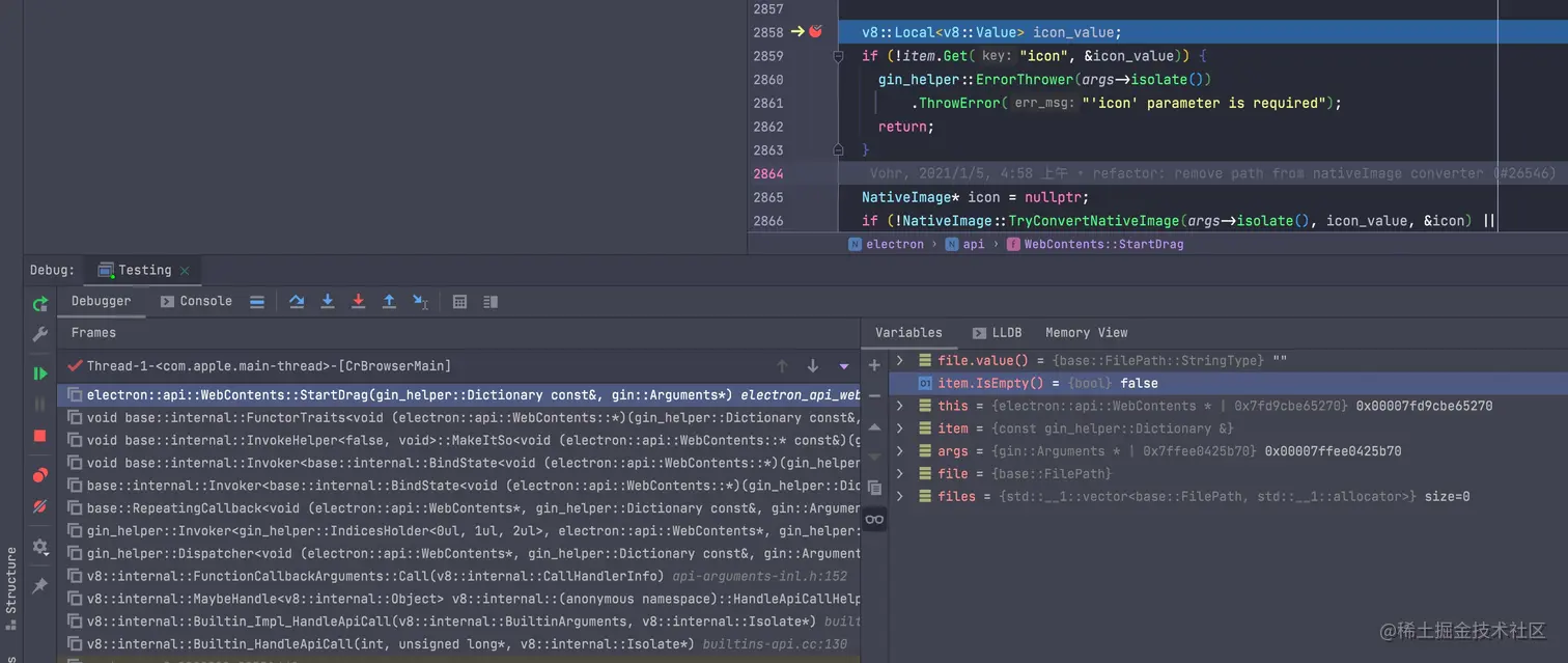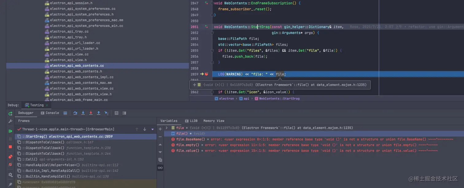 目前 electron 官方的 构建文档存在一些问题,当你完全按照文档上去做的时候,你会发现无法进行调试。 其表现就是在使用LLDB 时,无法看到当前 frame 下的变量信息和上下文。就像下图一样: