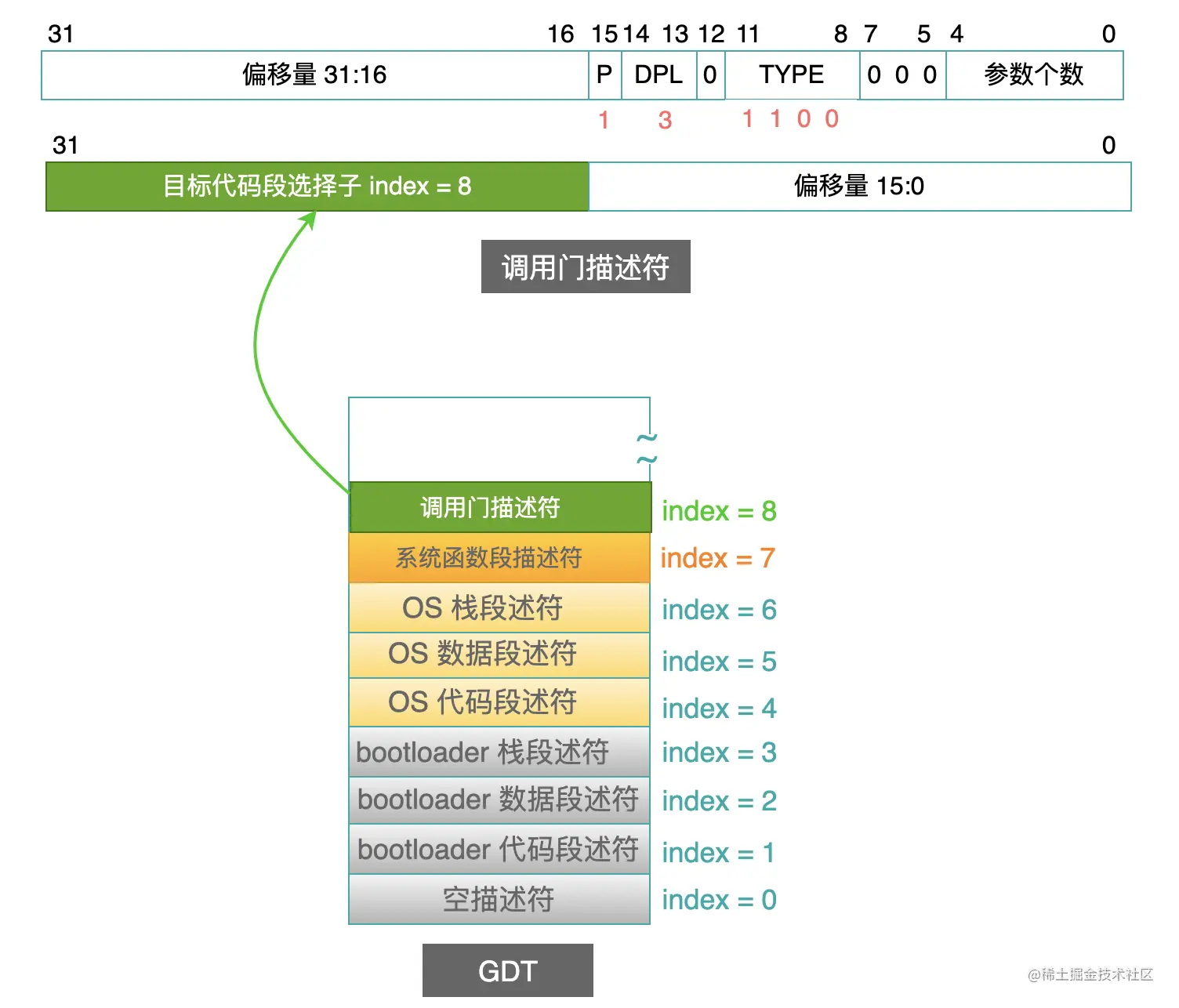 然后在GDT中,新增一个门描述符(index = 8),描述符中的“目标代码段选择子”中的索引号,就等于 8: