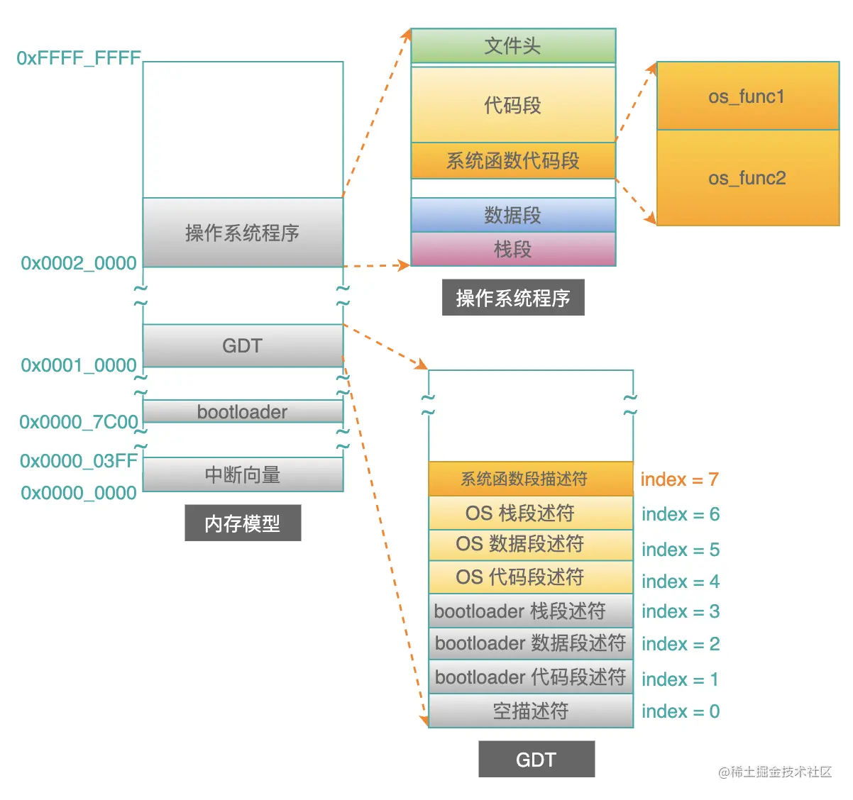 用户程序header中橙色部分的信息,表示操作系统提供的2个系统函数,位于操作系统的哪个段描述符中,偏移地址是多少。