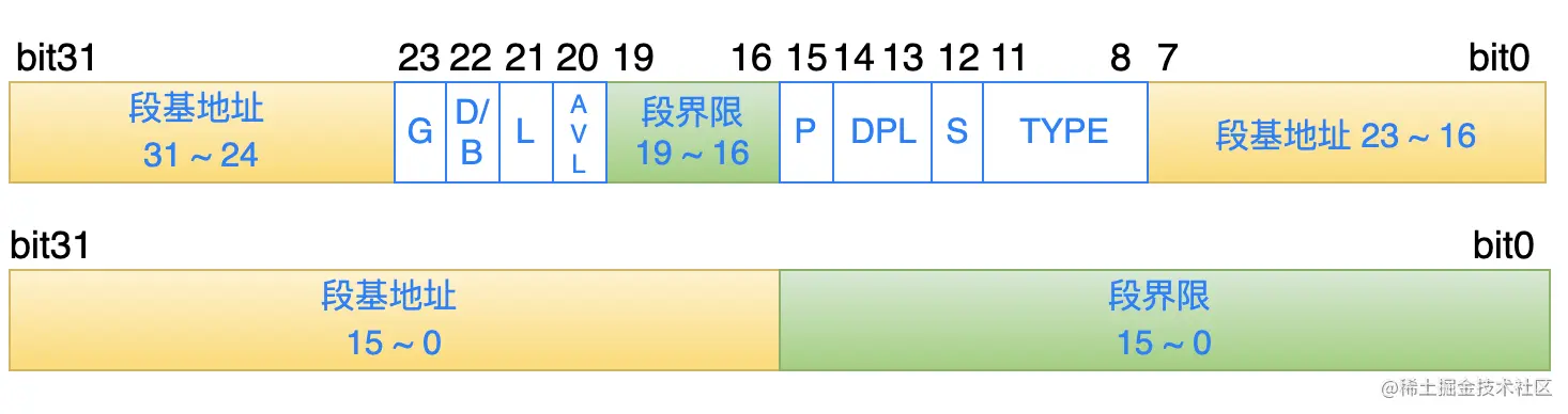也就是说:先通过门描述符找到代码段选择子,然后再用这个选择子到 GDT 中去查找真正的目标代码段描述符,最终找到目标代码段的开始地址和界限、属性等信息,也就是下面这个结构: