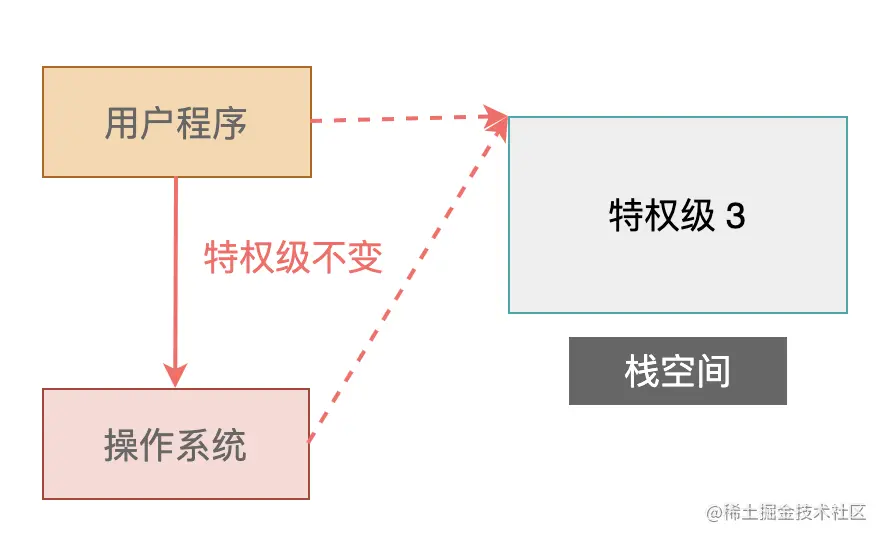 那么在系统函数执行的时候,使用的栈仍然是用户程序之前所使用的那个栈空间。