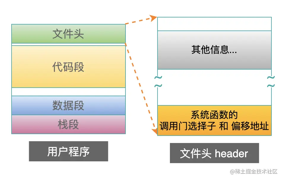 按照之前的惯例,操作系统可以在用户程序的头部header中的约定位置处,填写调用们的选择子以及函数偏移地址:
