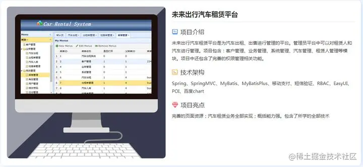 项目介绍:未来出行汽车租赁平台是为汽车出租、出售进行管理的平台。管理员平台中可以对租赁人和汽车进行管理。项目包含:客户管理、业务管理、系统管理、汽车管理、租赁人管理等模块。项目中还包含了完善的权限管理相关功能。