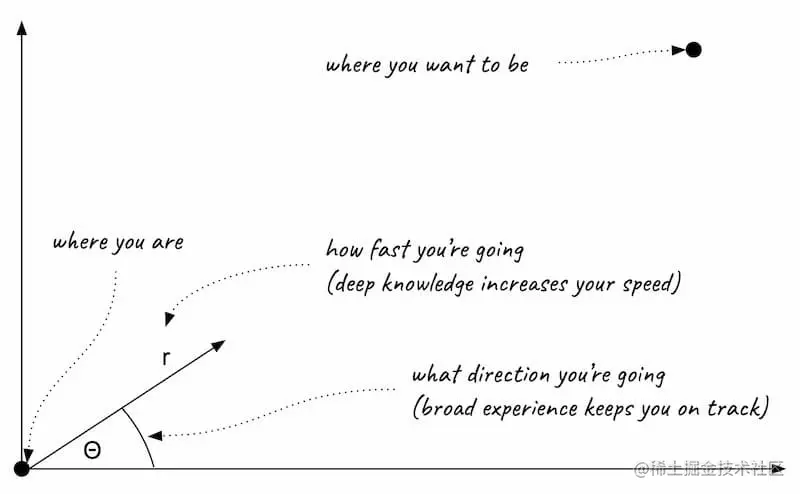 这就是全能程序员的优势,判断正确的仰角 θ,使得两点之间距离最短;特长程序员的优势是前进速度 r,可以在既定道路上做到快速前进。所以,知识的广度能告诉你什么是正确的方向,知识的深度则可以让你在该方向上快速前进。
