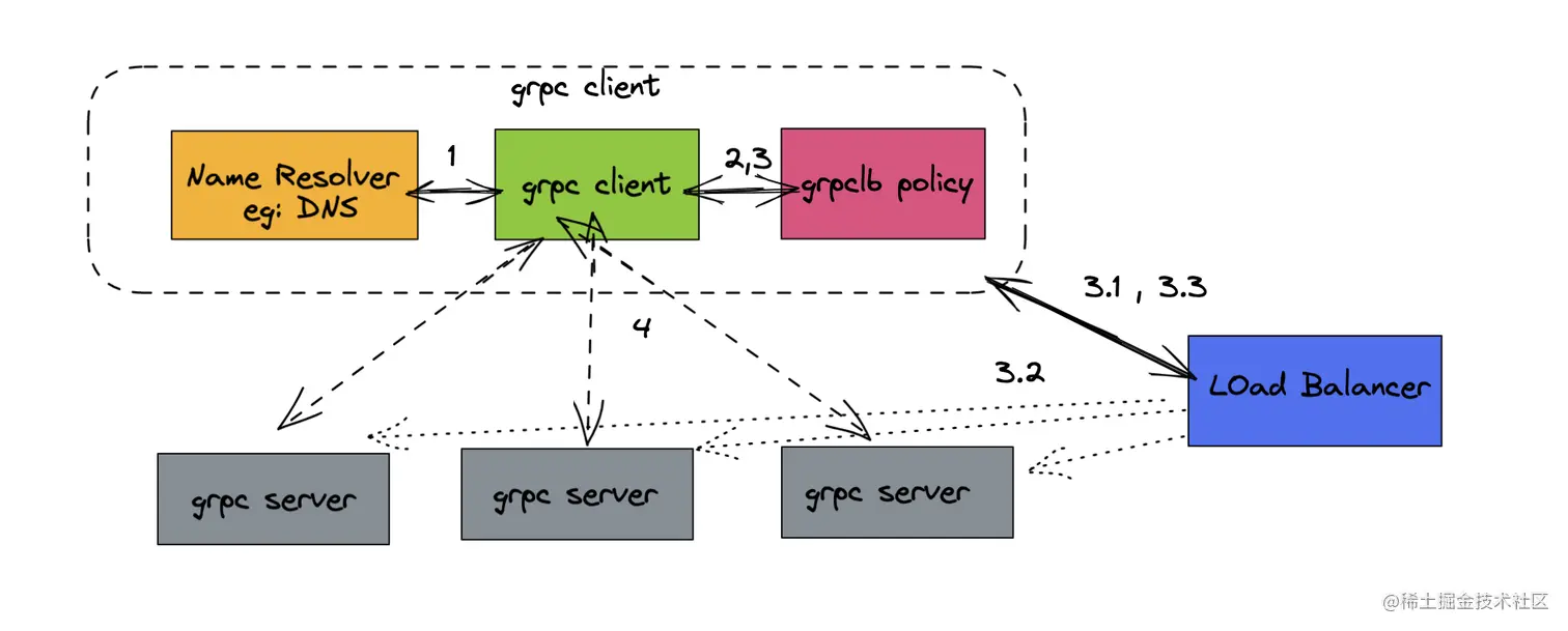 - 客户端实例化负载均衡策略,如果解析返回的地址是负载均衡器地址,则客户端将使用grpclb策略,否则客户端使用服务配置请求的负载均衡策略。