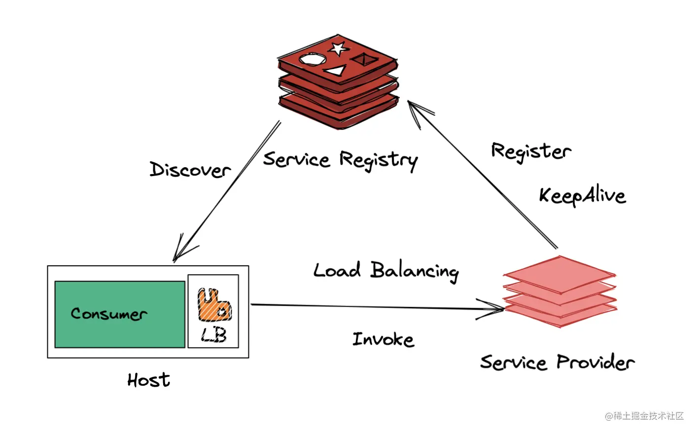 在服务消费者和服务提供者之间有一个独立的LB,通常是专门的硬件设备如 F5,或者基于软件如 LVS,HAproxy等实现。LB上有所有服务的地址映射表,通常由运维配置注册,当服务消费方调用某个目标服务时,它向LB发起请求,由LB以某种策略,比如轮询(Round-Robin)做负载均衡后将请求转发到目标服务。LB一般具备健康检查能力,能自动摘除不健康的服务实例。