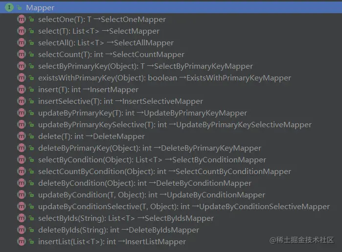 定义好基础Mapper后,就具有下图中的基本通用方法了。每个实体类对应的*Mapper继承Mapper来获得基本的增删改查的通用方法。