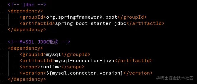 添加spring-boot-starter-jdbc以支持JDBC访问数据库,然后添加MySql的JDBC驱动mysql-connector-java;