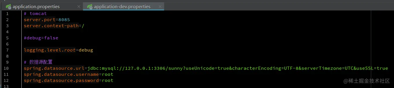之后在application-dev.properties里配置开发环境数据库的连接信息,添加之后,Springboot就会自动配置数据源了。