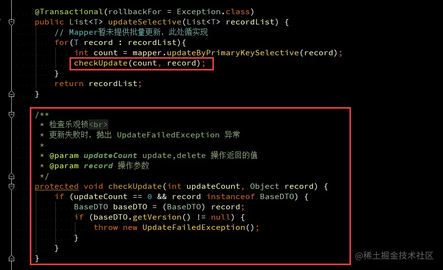 最后,如果版本不匹配,更新失败,需要往外抛出异常提醒,所以修改BaseService的update方法,增加检查更新是否失败。