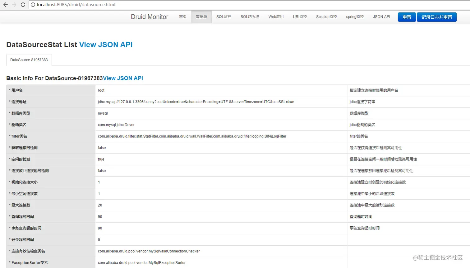 之后启动项目在地址栏输入/druid/index.html并登录就可以看到Druid监控页面: