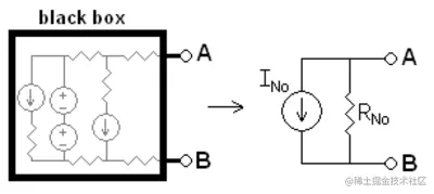 图 1.6.1 任何仅包含电压源、电流源和电阻器的黑匣子都可以转换为诺顿等效电路。