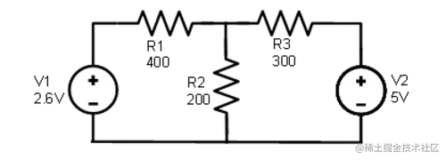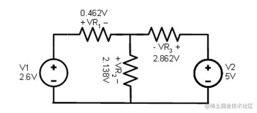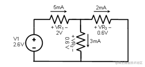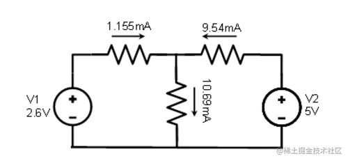 仅使用 2.6 伏电源分析电路,我们得到以下电压和电流值: