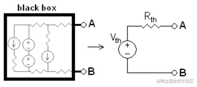 图 1.5.1 任何只包含电压源、电流源和其他电阻的黑匣子都可以转换为戴维南等效电路,恰好包含一个电压源和一个电阻。