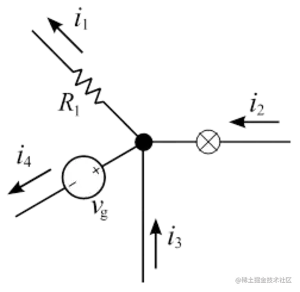电荷守恒原理意味着:在电路中的任何节点(结)处,流入该节点的电流之和等于流出该节点的电流之和。否则,电荷会在节点上无休止地累积或排出,这在物理上是不可能的。