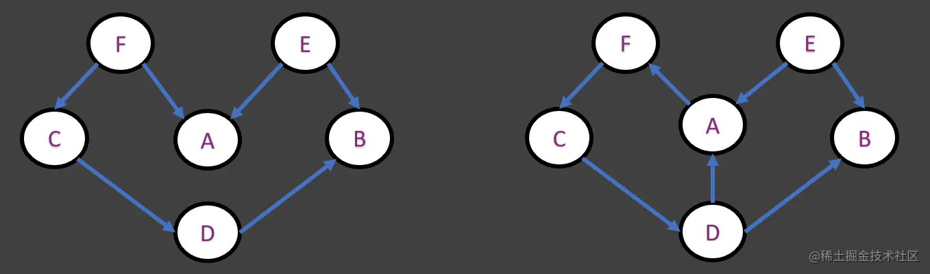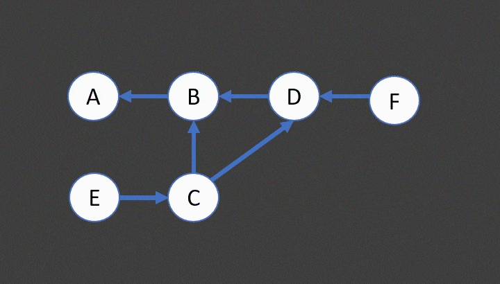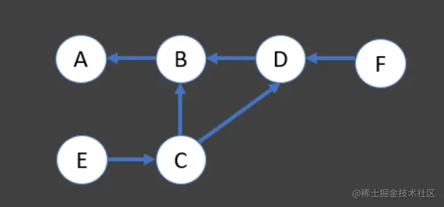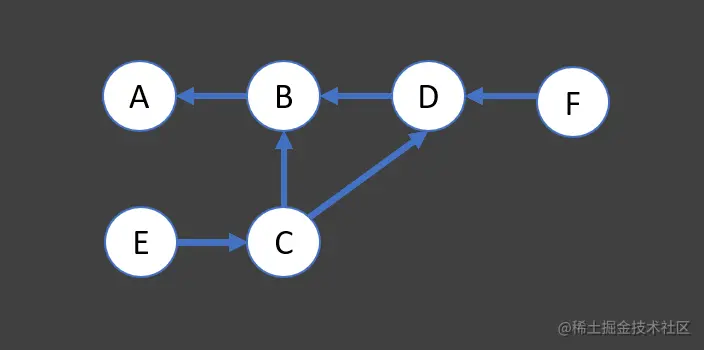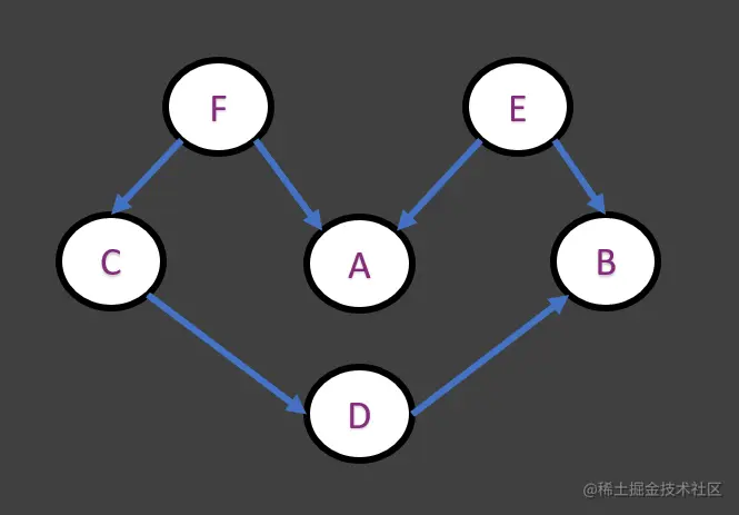 我们用图的结点表示单元格的计算内容,箭头代表依赖关系。入度为零的节点,完全不依赖其他节点内容,所以计算的顺序应该是从不依赖其他节点的节点内容开始。单元格A依赖F、E,D依赖C、B,C、B又分别依赖F、E,唯二不依赖其他节点的内容是E、F。