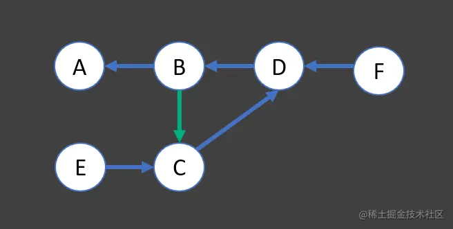 解决了有向无环图的计算问题,如果此时把上图中B-C之间的箭头反向调换,情况就会变的截然不同起来。此时B-C-D之间组成了一个环。