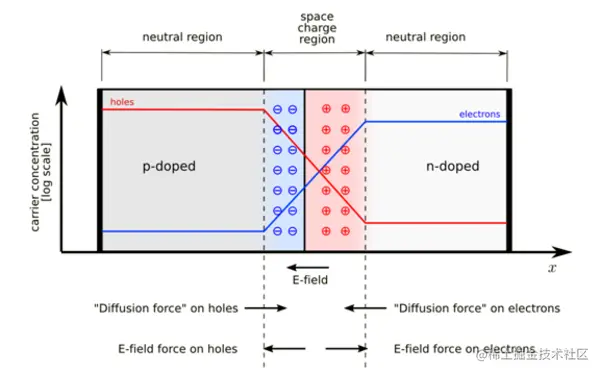 空间电荷区产生的电场与电子和空穴的扩散过程相反。同时存在两种现象:倾向于产生更多空间电荷的扩散过程,以及倾向于抵消扩散的空间电荷产生的电场。在平衡时,这两种力相互平衡。平衡状态下的载流子浓度分布如图 5.1 中的蓝线和红线所示。还显示了建立平衡的两种平衡现象。