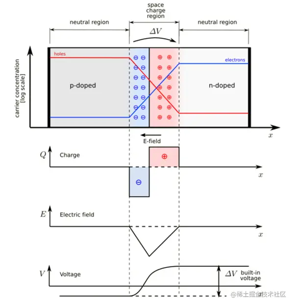在 p 型和 n 型半导体的结点处,靠近 PN 界面的 n 型区域中较高浓度的电子倾向于扩散到 p 型区域中。当电子扩散时,它们会在 n 区留下带正电的离子(供体)。类似地,靠近 PN 界面的 p 型侧上更高浓度的空穴开始扩散到 n 型区域,留下带负电荷的固定离子(受体)。PN 界面两侧紧邻的区域失去中性并带电,形成空间电荷区或耗尽层(见图 5.1)。