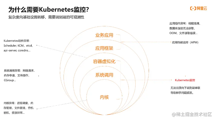 很多同学对应用性能监控应该并不陌生,这类监控主要关注业务应用逻辑、应用框架和语言运行时,监控对象有线程池满,数据库连接无法获取,MySQL, 内存溢出,还有各种调用链异常栈等。随着 Kubernetes 容器化技术带来的云原生技术演进,上层应用的开发和运维变得更加简单,但复杂度是恒定的,上层的复杂度降低必然伴随着底层的复杂度提升。如下图所示,复杂度逐渐转移到容器虚拟化层以及系统调用内核层对各种虚拟化技术的支持。每一层都可能出现问题,且这些问题会影响上层应用。比如容器虚拟化层的 Kubernetes 组件异常,如果调度器异常,Pod 将无法调度影响应用;比如文件系统相关的系统调用异常,上层应用无法读取文件,造成应用问题;比如内核异常,应用进程无法调度完成工作。