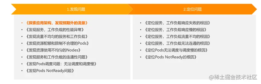 我们也将从两个类型去讲解,第一类是发现问题,主要包含五类问题的发现:应用架构问题、性能问题、资源问题、调度问题和网络问题。第二类是定位问题,主要包含对以上五类发现的问题进行根因定位,并且提供修复建议。