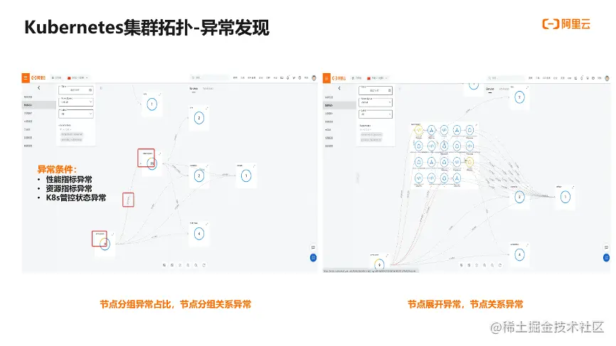 再看 Kubernetes 监控的异常发现能力,Kubernetes 监控通过三个维度的异常条件,将节点和边绘制成异常的黄或者红的颜色。具体来说,这三个维度是性能指标异常,比如说错误率大于 10%,平均响应时间大于 500 毫秒;第二,资源指标异常,比如 CPU 使用率大于 70%,内存使用率大于 70%;第三,K8S 管控状态异常,比如 POD 一直无法到达 ready 状态,在分组收起的状态下会显示节点分组的异常占比,展开分组可以看到特定的节点变得异常。通过该能力,我们可以快速发现特定的微服务或者微服务关系的异常。