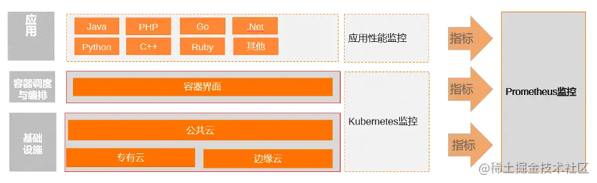 那么 Kubernetes 监控、应用性能监控、Prometheus 监控有什么异同点呢?下图清晰的表达了这三者的关系和区别,应用性能监控主要关注应用逻辑,框架与编程语言,而 Kubernetes 监控关注的是系统网络和容器界面,同时会向上关联应用性能监控。Prometheus 监控是基础设施,Kubernetes 监控和应用性能监控的指标类数据将会存储在 Prometheus 监控中。