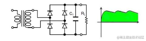 正如我们在前面的图中看到的那样,半波或全波整流不会产生恒压直流电。为了从整流交流电源产生稳定的直流电压,需要一个滤波器或平滑电路。在最简单的形式中,这可以只是一个跨接整流器直流输出端的电容器。在电压未完全平滑的情况下,仍会保留一定量的交流纹波电压。剩余纹波的幅度取决于负载在波形峰值之间对电容器放电的程度。
