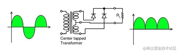 对于单相交流电,如果变压器采用中心抽头,那么两个二极管背对背(即阳极对阳极或阴极对阴极)可以组成一个全波整流器。与上述桥式整流器相比,变压器次级绕组需要两倍的绕组才能获得相同的输出电压。从变压器的角度来看,这不是那么有效,因为在交流输入的每个正负半周期间,电流仅流入次级的一半。