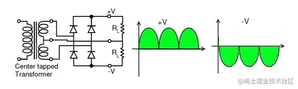 图 6.4 使用中心抽头变压器和 4 个二极管的双极性全波整流器。
