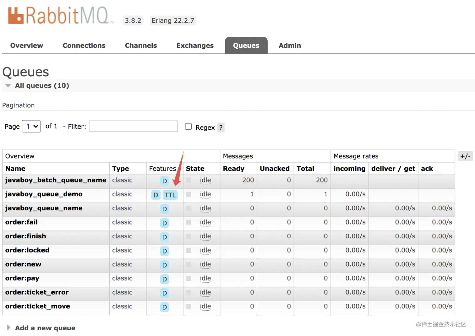 可以看到,消息队列的 Features 属性为 D 和 TTL,D 表示消息队列中消息持久化,TTL 则表示消息会过期。